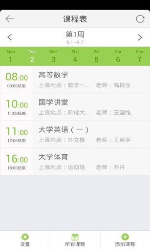 校園云通過與學(xué)校教務(wù)系統(tǒng)對(duì)接,用戶可直接下載查詢學(xué)期的個(gè)人課程,課程信息包括課程名稱、任課老師、上課地點(diǎn)、上課時(shí)間等。并同時(shí)提供自創(chuàng)建課表功能,用戶可設(shè)置包括課程名稱、任課老師、上課地點(diǎn)、上課時(shí)間等課程信息,同時(shí)支持課表數(shù)據(jù)同步到校園云服務(wù)器以備本地?cái)?shù)據(jù)丟失。