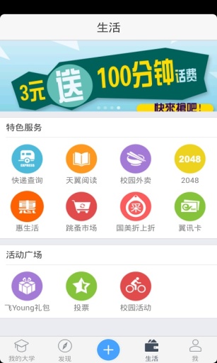 "生活"提供校園生活服務(wù),如:校園外賣、翼訊卡充值、天翼閱讀、周邊商家、游戲、校園活動(dòng)等。
