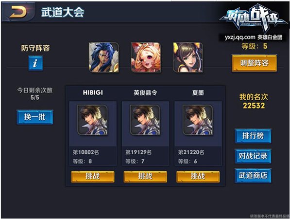 9、[武道大會(huì)]可以設(shè)置自己的陣容與對(duì)手進(jìn)行較量,也可以主動(dòng)挑戰(zhàn)排名比自己靠前的對(duì)手。