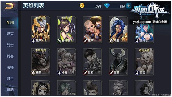 英雄:英雄選項(xiàng)卡中包含當(dāng)前《英雄戰(zhàn)跡》推出的所有英雄,在該選項(xiàng)卡中,玩家可以看到自己擁有和未擁有的英雄,英雄也分很多種,有坦克,戰(zhàn)士,刺客,法師,射手,輔助。玩家可以根據(jù)自己的喜好和團(tuán)隊(duì)的需求,來(lái)選擇英雄進(jìn)行戰(zhàn)斗。并且每周免費(fèi)英雄也可以讓你更好的體驗(yàn)英雄,選擇最適合自己的英雄。