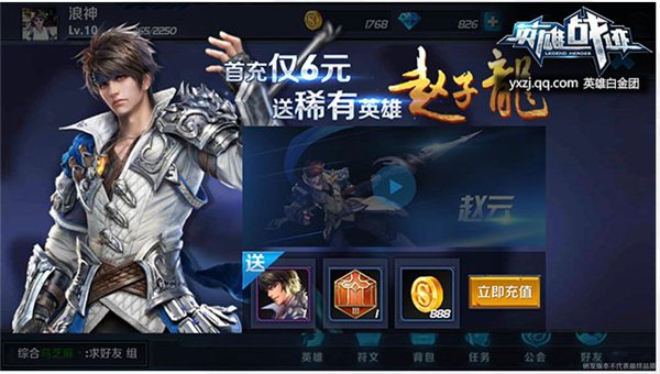 在游戲中,除了商城購(gòu)買(mǎi)可以獲得英雄之外,有些英雄只能通過(guò)活動(dòng)獲得,趙云就是其中之一。只要在游戲中充值任意金額,即可獲得趙云這名稀有英雄助陣。想讓趙云快速加入你的麾下嗎,充值6元即可擁有常勝將軍趙子龍了。同時(shí),在游戲中稀有英雄只能通過(guò)充值獲得,不能通過(guò)商城購(gòu)買(mǎi)獲得,喜歡趙云的玩家千萬(wàn)不可錯(cuò)過(guò)這個(gè)活動(dòng)。