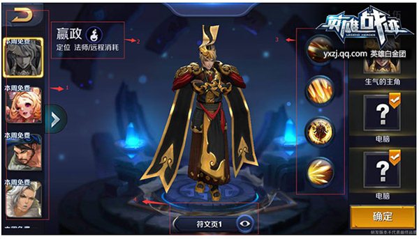 【1】是選擇英雄,我們可以通過(guò)上下劃動(dòng),來(lái)選擇自己心儀的英雄。點(diǎn)擊頭像就可以出現(xiàn)英雄的詳細(xì)信息。
