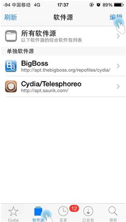 1、進入 Cydia 應(yīng)用,點擊“軟件源”欄目