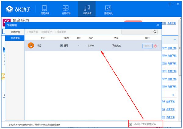 4、點擊進入下載管理==鈴聲壁紙==點擊導(dǎo)入