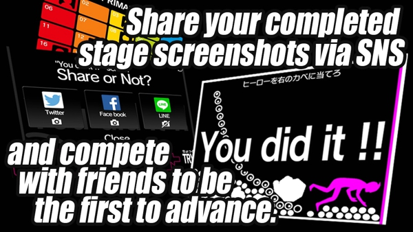 游戲內(nèi)置關卡多達幾十個,通過連接臉書、LINE等軟件分享信息還可以解鎖一部分關卡。關卡的難度梯度比較合理,后面的關卡難度簡直可以讓玩家發(fā)狂。游戲中除了用描繪的圖案通關以外,還需要合理利用一些物理原則,配合圖形的角度和下落位置產(chǎn)生意想不到的效果。不斷挑戰(zhàn)關卡,描繪多樣的圖案通關正是這款游戲的樂趣。