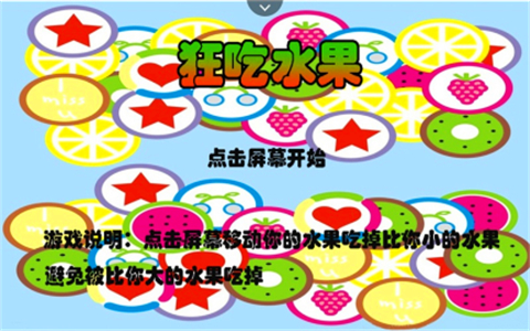 狂吃水果是一款躲避類的休閑游戲。點擊屏幕,移動你的水果去吃掉較小的水果,同時避開被大水果吃掉。