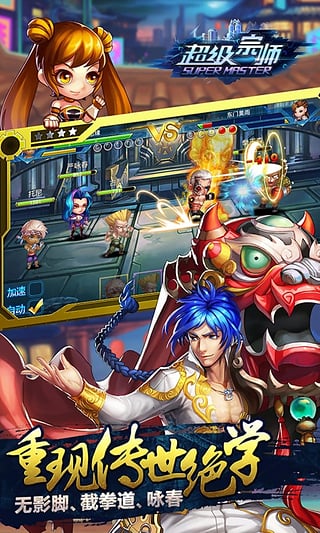 【經(jīng)典題材 近代功夫再出擊】不同于一般的手游題材,《超級宗師》重溫武風頂盛歲月,喚醒格斗熱血激情!游戲將寫實與Q萌結合,詠春堂、洪拳館、太極門、蔡李佛各派功夫,百花齊放。黃飛鴻、方世玉、李小龍、霍元甲歷代宗師,悉數(shù)登場。