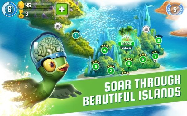 《怪翅逃亡 Oddwings Escape》飛過(guò)美麗的島嶼,完成令人興奮的挑戰(zhàn),發(fā)揮角色的潛力,和其他玩家一同競(jìng)爭(zhēng),玩家只需長(zhǎng)按屏幕的指定區(qū)域,并根據(jù)小鳥(niǎo)的飛行方向挪動(dòng)手指即可。不同的小鳥(niǎo)擁有不同的特殊技能,而且每只小鳥(niǎo)都有四種參數(shù),分別是速度、能量、轉(zhuǎn)向、磁鐵。速度不用解釋了,能量是指體力,轉(zhuǎn)向則是敏捷度,而磁鐵是小鳥(niǎo)的吸金能力。玩家可以通過(guò)闖關(guān)所獲的金幣,分別提升小鳥(niǎo)這四個(gè)參數(shù)。