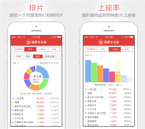 3、上座率:國內(nèi)最準(zhǔn)確的電影上座率監(jiān)控工具,隨時(shí)隨地查詢熱映影片的上座率、場均人次,全面監(jiān)控電影熱度;