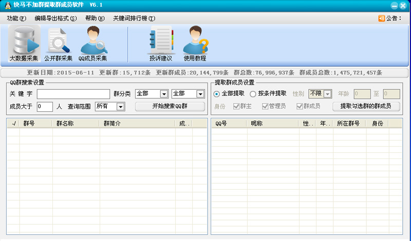快馬不加群提取群成員軟件是一款無(wú)需加入QQ群,該軟件可以實(shí)現(xiàn)高速、穩(wěn)定、全自動(dòng)的不加群提取群成員軟件,并且采用獨(dú)創(chuàng)的方法定期更新群成員數(shù)據(jù),讓用戶第一時(shí)間得到最新鮮的客戶資訊,是業(yè)務(wù)員,銷售員的必備工具。