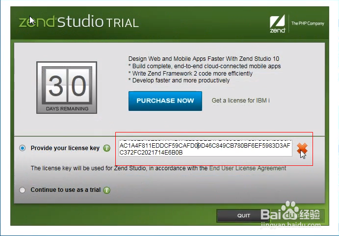 現(xiàn)在你再來打開我們的ZendStudio,同樣的第一次的時(shí)候它還是會(huì)讓你來輸入Key,這時(shí)候呢,你再把剛才那段Key(秘鑰)拷貝進(jìn)來。