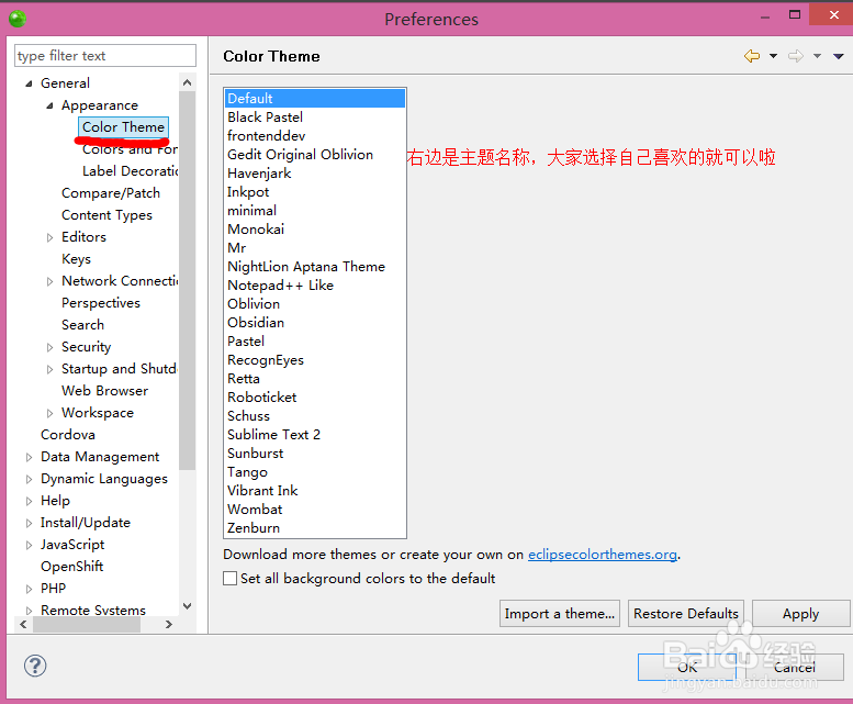 10.左側(cè)找到:General--Appearance--Color Theme;右邊是主題名字,點(diǎn)擊之后會(huì)出現(xiàn)預(yù)覽效果。至此ZendStudio主題安裝就完成啦!