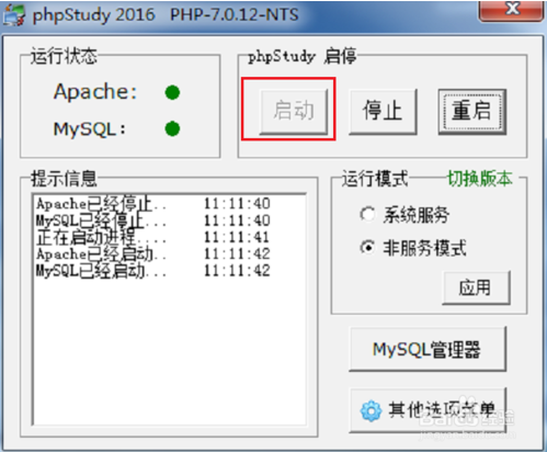 第一步我們需要安裝PHP集成環(huán)境,這里安裝的是phpStudy,安裝完成后,點(diǎn)擊啟動(dòng),如下圖所示:
