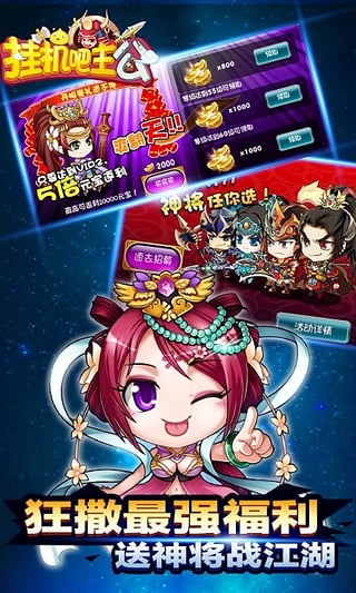 更新送限時(shí)神將!《全民掛三國(guó)》新增世界BOSS定時(shí)報(bào)名,全新“背水一戰(zhàn)”玩法重磅開(kāi)啟,主公光環(huán)閃耀來(lái)襲,火速進(jìn)階,狂熱戰(zhàn)斗,戰(zhàn)不能停!獨(dú)創(chuàng)24小時(shí)無(wú)間斷升級(jí)玩法,上古將星任性進(jìn)階,隨心所欲排兵布陣,花樣緣分巧妙搭配,更有彈幕萌空血槽!天天有新服,首充就送豪華神裝大禮包!