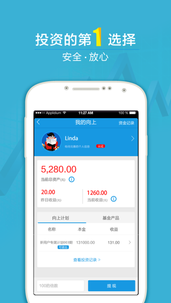 移動客戶端與WEB端基本功能保持一致,向上理財是P2P行業(yè)內(nèi)第一家在AppStore上線的客戶端。