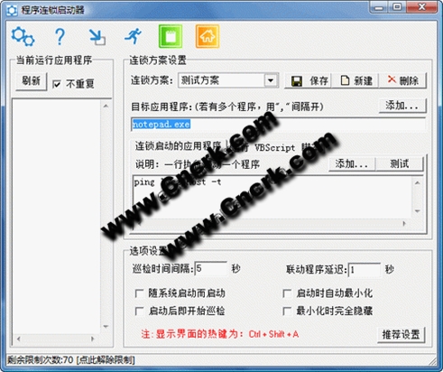 程序連鎖啟動器[exelink]是一個用于實現(xiàn)應(yīng)用程序之間連鎖啟動關(guān)系的工具。連鎖啟動是指程序之間需要同時運行的關(guān)系,比如當(dāng)A軟件運行時,需要同時啟動B和C軟件,又或者A、B、C軟件在任何時候均需要同時運行等.利用本工具來很方便的實現(xiàn)以上功能,尤其適合啟動一些針對某程序的后臺、外掛、接口處理程序。在本工具中若把A軟件作為目標(biāo)程序,B、C軟件設(shè)為連鎖啟動程序,則當(dāng)本軟件發(fā)現(xiàn)A已運行時,便會自動啟動B和C,即使B、C因人為或意外退出,本軟件也會再次啟動B、C,直至其穩(wěn)定運行為止。本工具可以設(shè)為隨系統(tǒng)自動啟動和退出,并隱藏自身,不會影響系統(tǒng)任何正常功能。1.2版本根據(jù)用戶的要求,加入了對VBS腳本的支持,用戶可以往程序添加VBS腳本,當(dāng)發(fā)現(xiàn)目標(biāo)程序時,可以執(zhí)行VBS腳本