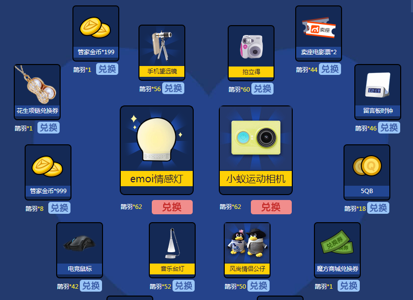 當(dāng)大家搭橋完成時可獲得搭橋鵲羽獎勵,集齊獎勵可以兌換金幣、Q幣、拍立得、相機等獎品。