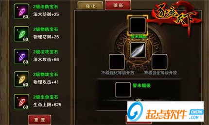 裝備養(yǎng)成最基本的三個步驟是:升級,鑲嵌,洗煉。升級主要花費銅錢,可提高強化等級、增加裝備屬性和裝備戰(zhàn)斗力,裝備等級隨時跟上主公的成長步伐是十分重要的。鑲嵌寶石,將各類寶石自帶的屬性附加在裝備上,高級寶石增加的數值非常可觀,但高級寶石的合成不止一朝一夕,需要日積月累聚沙成塔。裝備洗煉,為裝備附加額外屬性條目,自由度很高,還帶有一定的運氣成分,但裝備品質越高、可洗煉出的屬性條目就越多,屬性上限也越高。