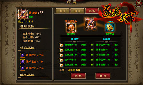 裝備強化是基礎,但裝備等級受到主公等級的限制。想繼續(xù)擴展屬性提升的空間,別忘了用心洗煉。一條好的洗煉屬性,遠超裝備等級帶來的屬性加成,提升的戰(zhàn)力更是驚人!如果你獲得了紫裝或橙裝,就不要吝嗇手中的洗煉石,雖然洗煉有風險,但是為了屬性和戰(zhàn)力,不要慫就是干!