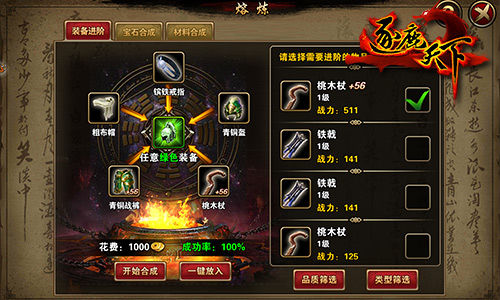 雖然我們的終極目標是紫裝乃至最高級的橙裝,但是新手階段推圖獲得的白裝可以用于武將進階,精英副本獲得的綠裝可以先給出戰(zhàn)武將穿上,前期綠裝增加的戰(zhàn)斗力還是不錯的。不過要記得隨時給綠裝升級,裝備等級上限與武將等級有關,一旦武將升級,記得立刻強化裝備。另外,有富余的白裝、綠裝,可以攢起來慢慢合成高品質裝備,要是運氣好、一不小心合出幾件紫裝,那你就可以碾壓群雄了!