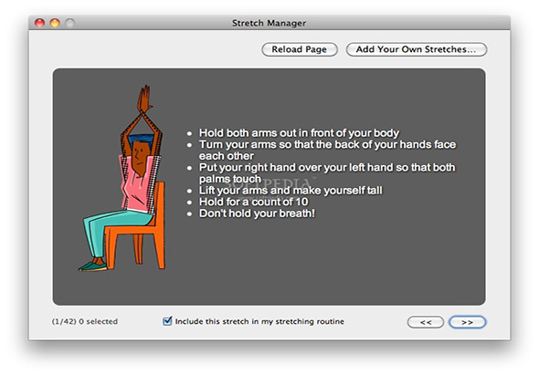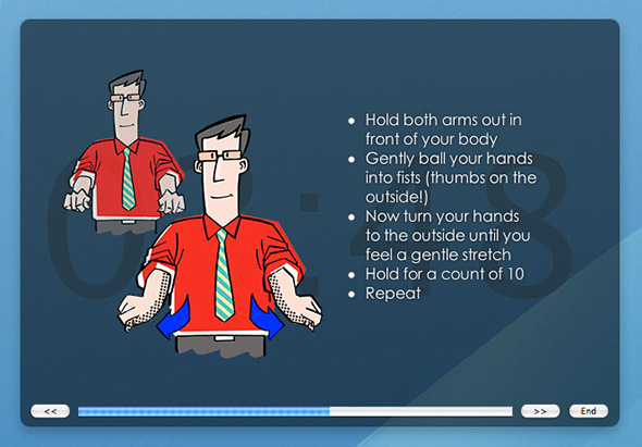 根據您的實際鍵盤和鼠標使用,你已經花了在屏幕前的時間,MacBreakZ建議休息和microbreaks在適當的時間間隔。MacBreakZ包括一組30個,旨在降低肌張力,改善姿勢和加強適當的肌肉群充分說明了伸展運動。它還具有幾十個偉大的符合人體工程學的技巧。