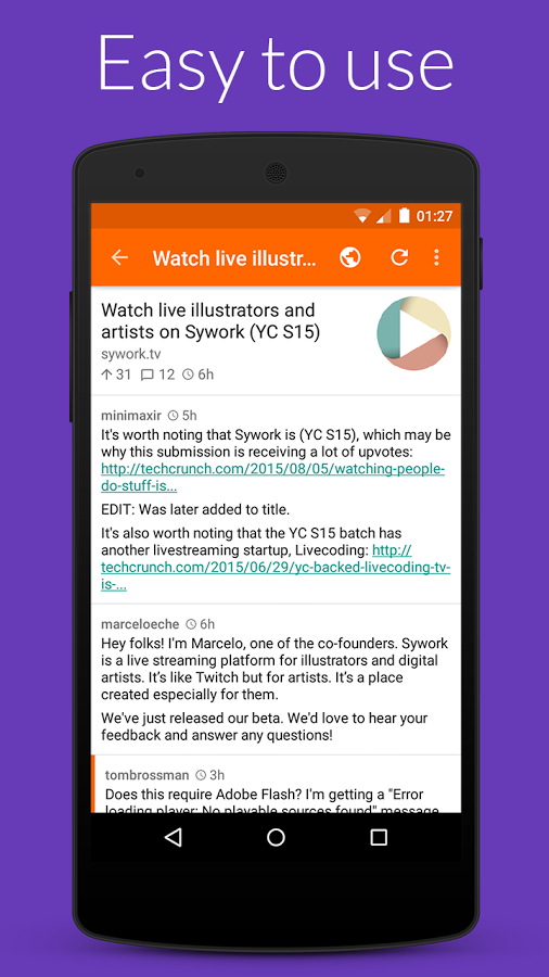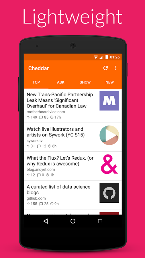 黑客新聞客戶端Cheddar是個精簡的用來閱讀黑客新聞網(wǎng)站的客戶端,這樣你便可以在手機上輕松閱讀最新新聞和評論。應(yīng)用免費且無廣告,并使用質(zhì)感設(shè)計。