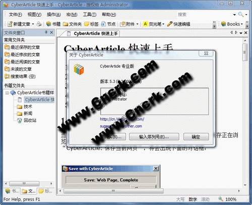 CyberArticle (網(wǎng)文快捕)是一款知識(shí)管理軟件,主要致力于網(wǎng)頁(yè)的保存和后期管理。CyberArticle (網(wǎng)文快捕)主要功能,就是收集和整理網(wǎng)頁(yè)。利用CyberArticle (網(wǎng)文快捕),您可以方便的在各種瀏覽器內(nèi),例如IE以及IE核心的瀏覽器,F(xiàn)irefox,Google Chrome,蘋(píng)果Safari,Opera等瀏覽器,保存您正在瀏覽的網(wǎng)頁(yè),或者批量保存您關(guān)心的網(wǎng)頁(yè)。同時(shí),CyberArticle (網(wǎng)文快捕)還可以管理各種資料,例如Office文檔(doc,xls,ppt),圖片,PDF,程序源代碼等等。保存后的資料,您可以非常方便的進(jìn)行管理,檢索,共享,制作電子書(shū)等等。同時(shí),您還可以使用CyberArticle (網(wǎng)文快捕)來(lái)撰寫(xiě)您的日記,搏客等等。CyberArticle (網(wǎng)文快捕)適用于個(gè)人和企業(yè),非常適合于個(gè)人和企業(yè)建立自己的知識(shí)資料庫(kù)