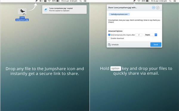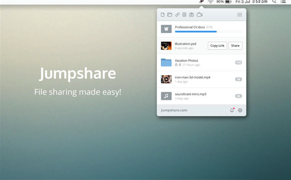 Jumpshare for Mac支持無限制的分享,共享任何文件都可以在線觀看。保存上傳的歷史與實(shí)時(shí)文件查看次數(shù)。支持自定義文件瀏覽器主題,可以使用短或長的URL分享鏈接(提高安全性)。Jumpshare for Mac可以獲取即時(shí)通知當(dāng)收件人查看或下載文件之時(shí)。轉(zhuǎn)貼,重命名或從菜單欄中popover窗口刪除文件??梢怨蚕砉P記,使用截屏,和截屏定制的鍵盤快捷鍵。支持分享到社交媒體:Facebook和Twitter,自動(dòng)檢測您的網(wǎng)絡(luò)設(shè)置,選擇上傳代理。