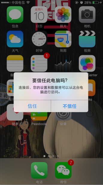 此時,你的蘋果手機(jī)用USB數(shù)據(jù)線連接到電腦(iPhone手機(jī),iPad平板,iPodTouch均支持)。如果是第一次連接蘋果手機(jī)到電腦,需要在手機(jī)上打開鎖屏,并點(diǎn)一下【信任】該電腦,如下圖