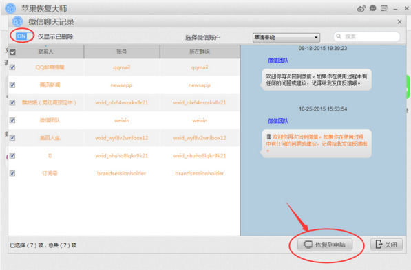 數(shù)據(jù)掃描與分析的過程,一般為5-10分鐘(具體時間各異,手機(jī)數(shù)據(jù)量大就稍微慢一點(diǎn)),分析完成后,就會直接跳到微信聊天記錄的結(jié)果列表界面,可以清楚的看到所有的聊天記錄以及被刪除的老天記錄,此時,點(diǎn)擊一下【恢復(fù)到電腦】就可以把所有微信聊天記錄(含本來就存在的和被刪除的聊天記錄),如下圖所示