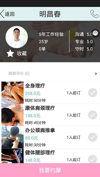 約摩 v2.5.0 安卓版 約摩app,一款便捷的按摩理療上門服務軟件。全身理療、康體肩頸理療、辦公頸肩推拿、健體腰部理療、足底按摩等中醫(yī)按摩項目均有,隨時下單,快速安排專業(yè)按摩師上門,為您提供最舒心最熱情的按摩服務。
