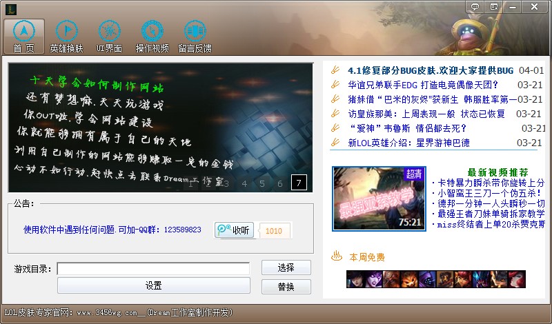 啟動(dòng)這款英雄聯(lián)盟皮膚修改器之后,會(huì)彈出一連串的廣告窗口,不影響使用,關(guān)掉就是了,進(jìn)入輔助主界面之后,選擇好英雄聯(lián)盟游戲的安裝目錄,然后切換到英雄換膚,即可開(kāi)始對(duì)lol中的英雄換膚。