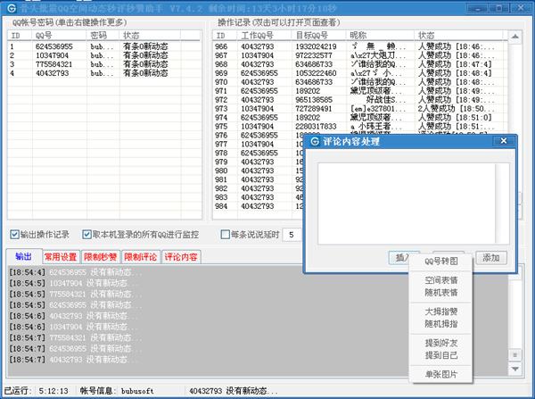 骨頭批量QQ空間動(dòng)態(tài)秒評(píng)秒贊助手是一款由骨頭軟件推出的空間秒贊秒評(píng)軟件,這款軟件體積小巧,資源占用低,它能幫助你隨時(shí)監(jiān)控你的空間好友動(dòng)態(tài),一旦你的好友有新的說(shuō)說(shuō)或日志發(fā)布,它就能幫助你一鍵秒贊秒評(píng),非常給力,目前支持獲取本機(jī)QQ,免驗(yàn)證碼登錄功能,QQ狀態(tài)保持避免重復(fù)登錄,智能融入骨頭多年掛機(jī)群發(fā)經(jīng)驗(yàn)之秘籍。