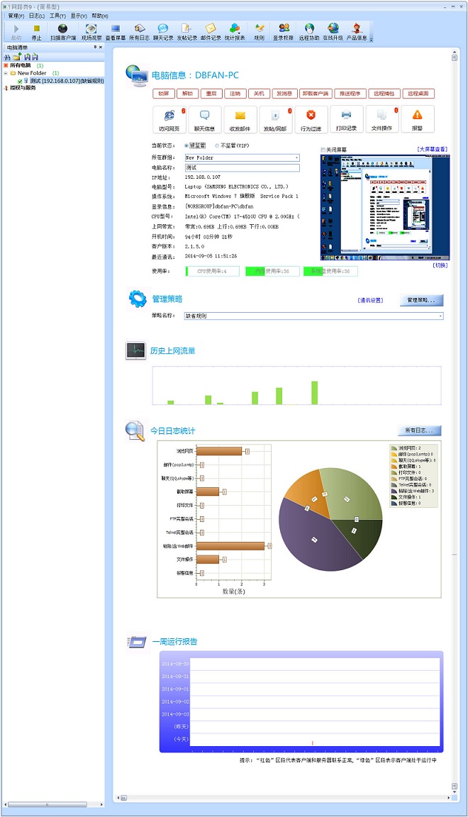 網(wǎng)路崗9局域網(wǎng)監(jiān)控軟件是最適合企業(yè)的上網(wǎng)行為控制和員工電腦管理產(chǎn)品,保護(hù)公司資料,如禁止U盤拷貝、備份郵件和打印輸出資料等等,記錄上班炒股、看視頻、網(wǎng)購、炒私單等等不良行為,精準(zhǔn)控制個(gè)人網(wǎng)絡(luò)帶寬,控制搶占帶寬資源,記錄常用的聊天內(nèi)容、QQ文件傳輸?shù)取?br />網(wǎng)路崗9客戶端