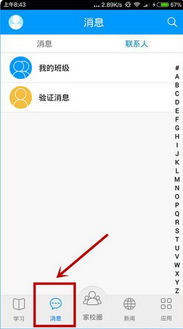 2、點擊“消息”按鈕,在這里你可以與家長、學(xué)生、老師進行在線溝通,還可以加入“我的班級”進行群聊,與同學(xué)一塊兒討論學(xué)習(xí)哦;