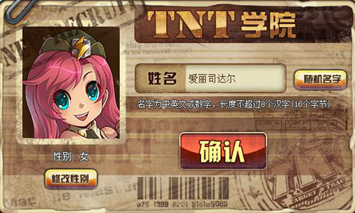 1、建立角色需要設(shè)置您的游戲昵稱,并選擇角色性別(姓名可為中英文或數(shù)字,長(zhǎng)度不超過16個(gè)字符),輸入后系統(tǒng)自動(dòng)檢測(cè)昵稱是否可用。如果實(shí)在想不出要叫什么昵稱,TNT還很貼心的為你準(zhǔn)備了【隨機(jī)名字】按鈕,輕輕一點(diǎn)擊,就不用為昵稱煩惱了, 填寫完畢后,點(diǎn)擊【進(jìn)入游戲】按鈕,就可以進(jìn)入游戲。
