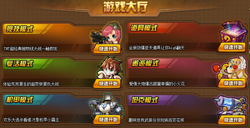 TNT游戲分為競(jìng)技模式、復(fù)活模式、道具模式、邂逅模式、機(jī)甲模式、和熱血排位以及連勝競(jìng)技場(chǎng),神秘模式即將開放,請(qǐng)T友敬請(qǐng)期待。1、競(jìng)技模式