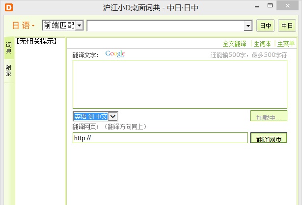 2、在滬江小d日語詞典文字框內(nèi)輸入需要翻譯的文字,選擇翻譯語種,輸入需要翻譯的網(wǎng)頁網(wǎng)址。