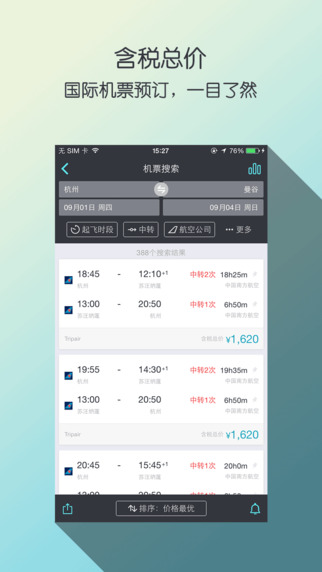 天巡旅行IOS版是一款全能快捷的旅游一鍵式服務軟件。這款軟件界面簡潔,操作簡單,功能強大,像機票、酒店、租車、門票、各種查詢、預訂服務等能幫你輕松解決!有了天巡旅行,出行不再是問題!天巡旅行為您提供一站式國際機票、特價機票、廉價航班、酒店、租車、門票和度假查詢及預訂服務,并且不收取任何附加費,讓您的旅行規(guī)劃、自由行、出境游等變得省心省力!