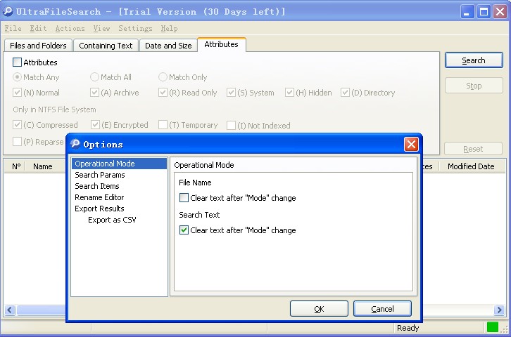 Ultra File Search文件搜索軟件搜索結(jié)果可以整理柱(向上,向下或兩者都不)。結(jié)果窗口支持Windows Explorer的功能(如圖示,上下文菜單)。具體行動(dòng)可以進(jìn)行對(duì)結(jié)果(如打開(kāi)文件夾,打開(kāi)所在的文件夾),而且他們可以以各種格式輸出(普通文本文件,標(biāo)簽式文本文件,CSV格式,HTML格式,XML)等。 Ultra File Search文件搜索軟件不使用背景索引,不浪費(fèi)系統(tǒng)資源,不使用額外的磁盤(pán)空間。