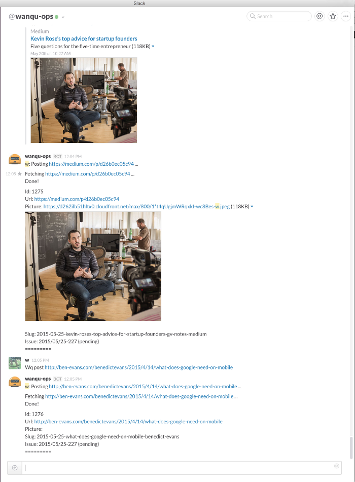 我在Slack上跟機(jī)器人wanqu-ops說話,發(fā)給它一個(gè)鏈接。
