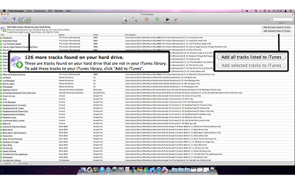 TuneSweeper掃描你的音樂沒有列在您的iTunes資料庫硬盤。通過點擊一個按鈕可以添加額外的音樂到你的iTunes音樂庫。