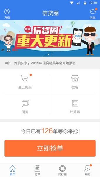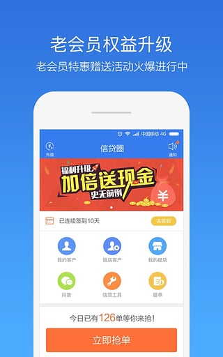 信貸員移動獲客平臺。移動獲客,實時接單,智能匹配,接單到手軟。作為一款集獲客、展業(yè)、同行業(yè)溝通、一手信息獲取等功能于一體的信貸員終極工作平臺,信貸圈一直致力于幫助信貸員通過移動端貨客、同城交流及實現(xiàn)更好的訂單管理。首創(chuàng)實時接單,主動出擊獲取優(yōu)質(zhì)資源,一分鐘創(chuàng)建信貸員自有微店,點對點受理客戶需求。信貸圈,為信貸員高效把握商機,成就夢想而服務。【更新日志】