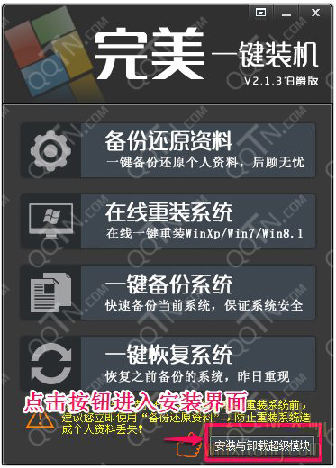 1.運(yùn)行完美一鍵裝機(jī)軟件,然后點(diǎn)擊安裝與卸載超級模塊按鈕如下圖所示: