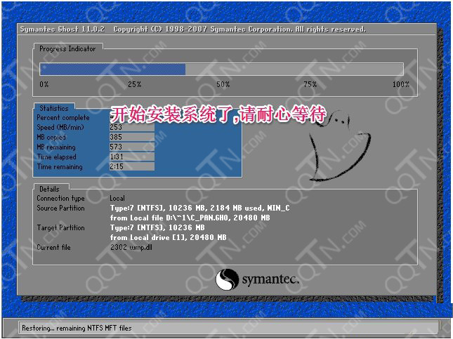 3.重啟后會進(jìn)入GHOST還原界面,如果您重啟后直接進(jìn)系統(tǒng)了。并沒有進(jìn)入下面的畫面,一般來說是殺毒軟件阻止了。請先進(jìn)入系統(tǒng),退出殺毒軟件然后重新點(diǎn)擊安裝系統(tǒng)。
