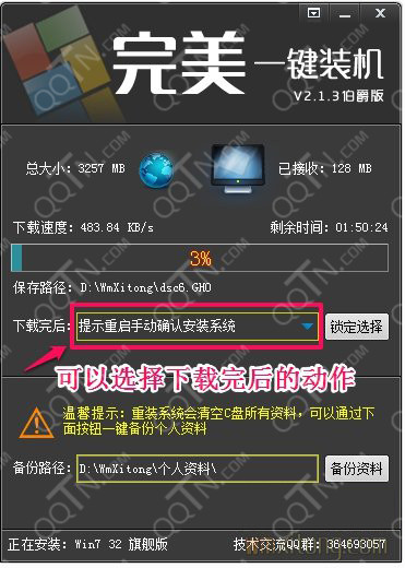 提示:完美一鍵裝機(jī)軟件支持?jǐn)帱c(diǎn)續(xù)傳,在下載文件時(shí)您大可以隨時(shí)關(guān)閉軟件,下次在運(yùn)行軟件安裝選擇相同的系統(tǒng),軟件會接著上次下載的進(jìn)度繼續(xù)下載。 進(jìn)入下載頁面了,在這個(gè)頁面里有個(gè)下載完成后的選項(xiàng),默認(rèn)是“提示重啟手動確認(rèn)安裝系統(tǒng)”,意思是說系統(tǒng)鏡像文件下載完成后,會彈出個(gè)詢問框,問您是不是要現(xiàn)在立即重啟并安裝系統(tǒng)?!爸幌螺d系統(tǒng),不安裝系統(tǒng)?!边@個(gè)沒什么好說的,就是只下載系統(tǒng)鏡像文件保存在硬盤,先不安裝系統(tǒng)?!盁o需確認(rèn)自動重啟并安裝系統(tǒng)”,下載鏡像完成后,電腦就會直接重啟并安裝系統(tǒng),如果您人不在出去外面了,可以選擇這個(gè)。