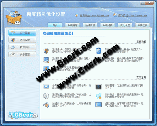 主功能:系統(tǒng)保護(hù),系統(tǒng)清理,系統(tǒng)信息,系統(tǒng)維護(hù),優(yōu)化設(shè)置。