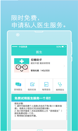 1.科學(xué)管理您的血糖:科學(xué)的檢測血糖是糖尿病人日常管理中的重要部分。軟件內(nèi)置血糖測量方案,按時提醒,方便記錄,日常的血糖數(shù)據(jù)可以在復(fù)診時給醫(yī)生作為治療參考。數(shù)據(jù)遠程存在云端,永不丟失。