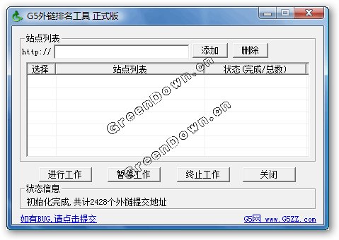 G5外鏈排名工具 V1.0 簡體中文綠色免費版 G5外鏈排名工具可以將您的網(wǎng)站瞬間提交到3000多個不同的網(wǎng)站目錄,從而提高網(wǎng)搜索引擎曝光率,進而達到增加網(wǎng)站外部連接的效果。本軟件優(yōu)點消耗系統(tǒng)資源小,目前可以支持自定義提交地址。