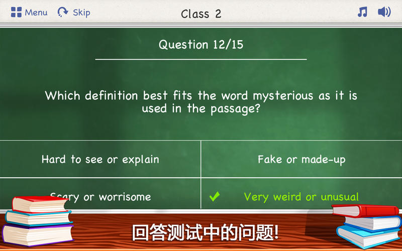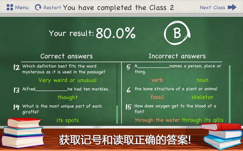 在這里,你首先開始第一年級活動學習,然后繼續(xù)你的英語之后推到一個新的水平。你不能跳過課程或壞的分數(shù)進到下一個等級。只有A,只有完美的結(jié)果可以贏!